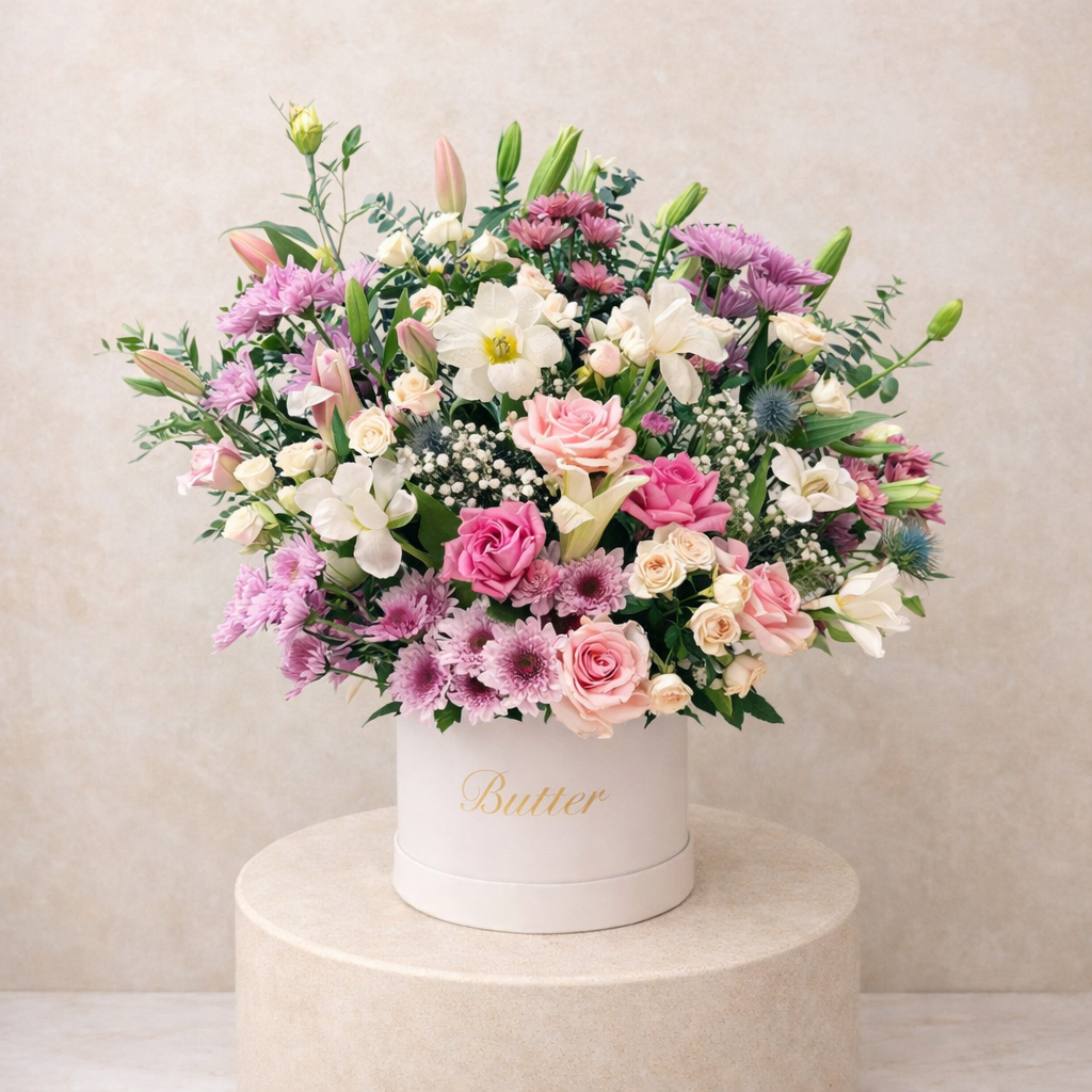 Featuring lilies, roses, chrysanthemums, and delicate fillers, this composition is artfully arranged in our signature Butter box and presented on a sculptural pedestal for a modern, elevated look.